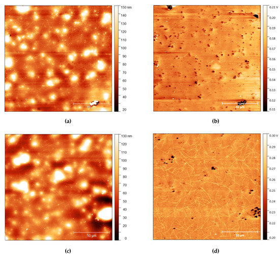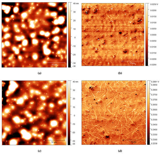 (a) AFM height map of cis-PI films with 2.5% loading of C12E5 and (b) Adhesion maps for the same position on the same film; (c) height map of the same film shown in the top AFM images after 10 s rinse and (d) the adhesion map.