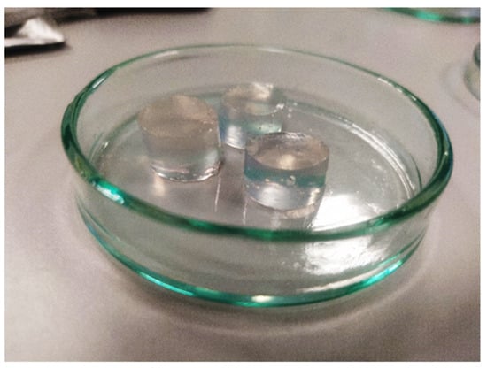 Mechanical properties were tested using the Zwick & Roel testing machine (Zwick & Roel, Ulm, Germany). The materials were cut into cylinders of 10 mm thickness and 15.8 mm in diameter (Figure 1). At least 5 samples of each kind were placed between two discs and pressed with the crosshead speed set at 0.5 mm/min. The maximum compressive strength (σmax) and compressive modulus (Emod) were evaluated. The results are presented as mean values with standard deviation.
