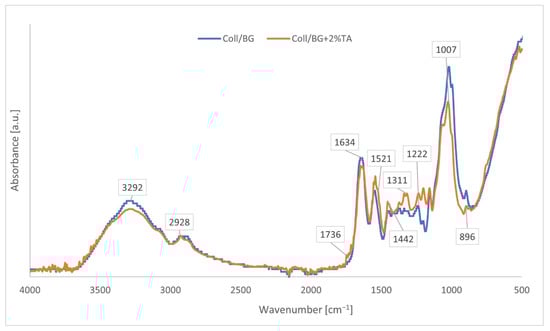 ATR-FTIR spectroscopy was applied for the identification of the chemical structure of the compounds. The ATR-FTIR spectra of Coll/BG and Coll/BG + 2%TA are shown in Figure 2. The Coll/BG spectrum showed groups such as Amide A (3292 cm−1), Amide B (2928 cm−1), Amide I (1634 cm−1), Amide II (1521 cm−1), Amide III (1222 cm−1) characteristic for collagen samples. The maximum peak at 1007 cm−1 corresponded to glucopyranose moiety, and at 896 cm−1, a characteristic of β-linked glycosidic bonds constituted characteristic adsorption peaks for β-glucan. Those peaks were also present in the spectra crosslinked with tannic acid.