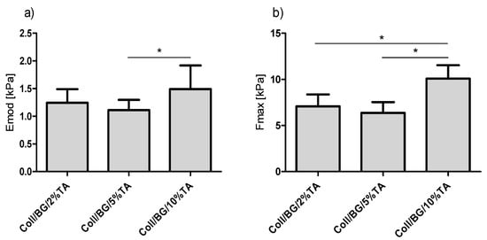 The results of mechanical parameters tests are presented in Figure 3. Although some increase in the comprehensive modulus (Emod, Figure 3a) with the increase in tannic acid content could be noticed in some samples, these differences were not statistically significant (p <0.05). The maximum tension (σmax, Figure 3b) increased after the addition of 10% of tannic acid, but this was not statistically significant (p > 0.05). Additionally, no statistically significant changes in the maximum tension values were observed for hydrogels with 2% and 5% TA.