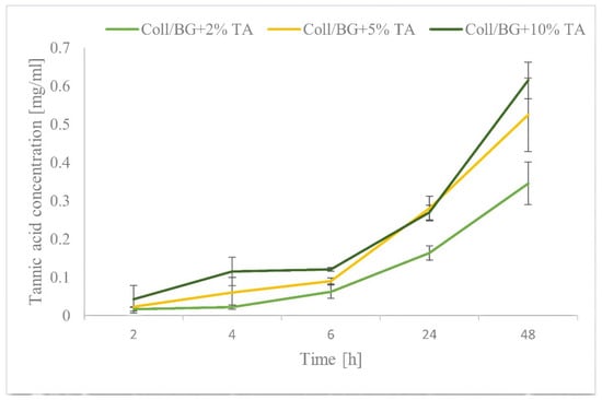 The release rate of the tannic acid is shown in Figure 4. The concentration of the released tannic acid depended on the initial content of tannic acid in the hydrogel. The released amount of TA increased with the time of the samples’ immersion in PBS. We observed a higher release of TA with higher concentrations of tannic acid in the hydrogel. The tannic acid was released gradually over time; there were no sudden bursts in the release of polyphenol from the matrix. The latter is an advantage because it allows for the construction of controlled delivery systems.