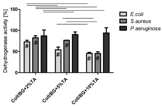 Dehydrogenase activity of Escherichia coli, Staphylococcus aureus, and Pseudomonas aeruginosa after 1 h of contact with hydrogels (#—significant difference from the control; lines between bars mark significant differences between groups.