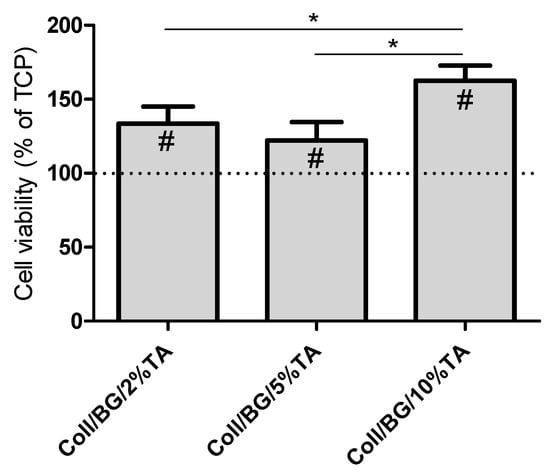 The human keratinocytes’ (HaCaT cell line) viability is presented in Figure 7. Previously, we showed that materials based on the fish skin collagen and β-glucan were not toxic when composed at the 90/10 ratio of Coll/BG []. In this work, all the extracts obtained from the studied hydrogels increased the HaCaT cells’ viability compared to TCP, namely by 20–60% compared to TCP, depending on the TA content. The highest cell viability could be observed for Coll/BG + 10%TA, and it was significantly higher than for the respective hydrogels with 2 and 5% of TA.