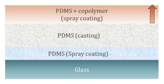 A solution of the same composition was pre-sonicated for 10 min and then cast onto the bottom layer (~400 μm thickness). Subsequently, a final top layer was deposited by spray-coating the PDMS-based formulation reported above, in which the copolymer additive (10 wt% or 20 wt% relative to HO-PDMS-OH) was added. Approximately 0.5 mL of solution were sprayed on each glass slide. After the deposition of each layer, the films were left at room temperature for 12 h and then thermally annealed in a vacuum oven at 120 °C for 12 h.