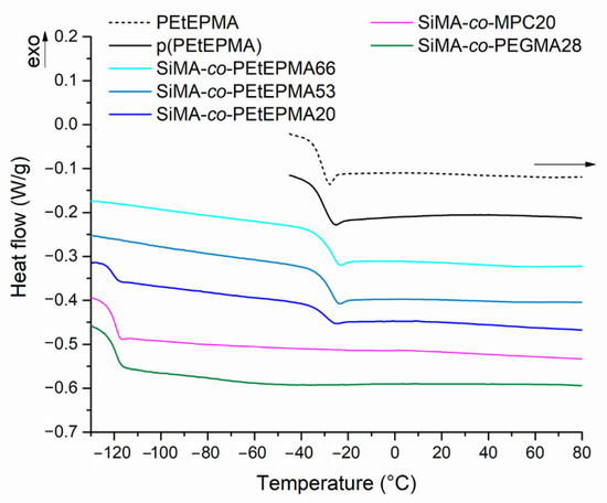 All of the polymers were found to be completely amorphous (Table 2). Poly(alkyl ethylene phosphonate)s with short alkyl side chains are reported to have Tgs around −40/−45 °C, and in particular, poly(ethyl ethylene phosphonate)s with various molecular weights exhibit Tg values lower than −50 °C [2,48]. PEtEPMA and p(PEtEPMA) showed glass transition temperatures at ca. −31 °C. SiMA-co-PEtEP20 presented two Tgs at −121 °C and −29 °C, attributed to the SiMA and PEtEPMA components, respectively. In contrast, copolymers with a higher ratio of PEtEPMA (above ≥ 53 mol%) only showed a single Tg, close to the value of the polyphosphonate homopolymers. The presence of only one Tg in the thermogram was likely due to the relatively low weight amount of SiMA in the copolymers.