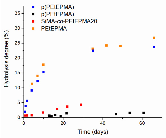 The hydrolysis kinetics of polyphosphonate-based (co)polymers is reported in Figure 4. Homopolymer p(PEtEPMA) and its monomer PEtEPMA presented similar hydrolysis kinetics at a pH ~ 10. In both cases, the degradation rate slowed down significantly after 20 days, and HD values seemed to reach a plateau at 20–30% after 35 days. Moreover, at a lower pH of ~ 8.2, typical of artificial sea water, the hydrolysis of p(PEtEP) was significantly slowed down. Hydrolysis was also observed for the copolymer SiMA-co-PEtEP20; however, as the polymer was water-insoluble, it was dissolved in deuterated THF with ~ 10 vol% of a bicarbonate buffer at a pH ~ 10. Despite the milder experimental conditions, the copolymer showed hydrolysis, even though the kinetics resulted to be significantly slower than that observed for the p(PEtEPMA) at a pH ~ 10. The lower hydrolysis rate was possibly also due to the higher hydrophobicity of the SiMA units in the copolymer. Similar findings had been reported for other non-water-soluble amphiphilic hydrolyzable copolymers, e.g., those containing silyl (meth)acrylate units [40]. Therefore, polyphosphonates were observed to undergo limited degradation (~2%) within two months at a pH ~ 8.2, while faster hydrolysis rates and more extensive degradation (20–30%) were observed at a pH ~ 10.