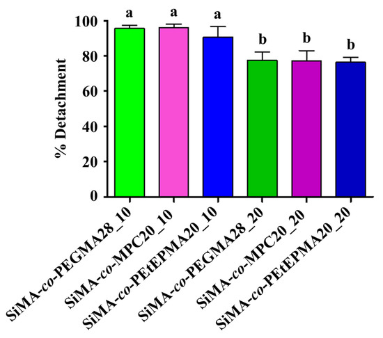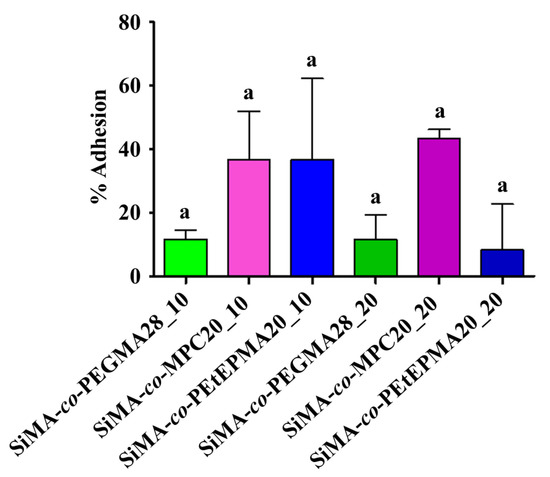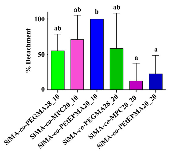 The antifouling performance of three-layer films was assessed against F. enigmaticus on a laboratory scale. In the settlement (adhesion) test, competent larvae of F. enigmaticus were directly pipetted on the polymer surfaces, and the percentage of adhesion was evaluated after five days of incubation. Figure 5 shows that the percentage of adhered larvae on amphiphilic films was lower than ~40% in any case. The initial hydrophobic surface was beneficial in slowing the settlement of the larvae, which are known to better adhere to hydrophilic rather than hydrophobic substrates [20]. Overall, the different copolymer chemistries and loadings did not show clear trends and statistically significant differences, thus indicating that the PEGMA, MPC, and PEtEP hydrophilic components possess a similar antifouling performance against this specific organism. Nevertheless, it is known from the literature that a marked hydrophilic nature of the coatings promotes the release of F. enigmaticus under relatively low shear stresses [58]. Consistently, the detachment percentage of F. enigmaticus (Figure 6) was found to be the highest for SiMA-co-PEtEPMA20_10, which displayed the most hydrophilic surface, wherein its water contact angle after 28 days of immersion in water was the lowest. Moreover, F. enigmaticus detachment was generally easier from the films with a lower wt% of copolymer additive, although this trend was not statistically significant.