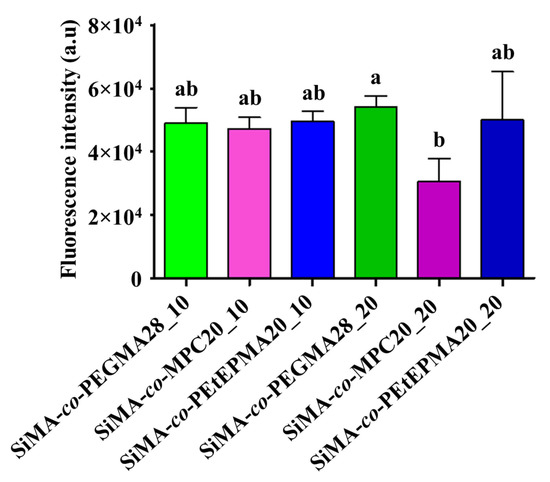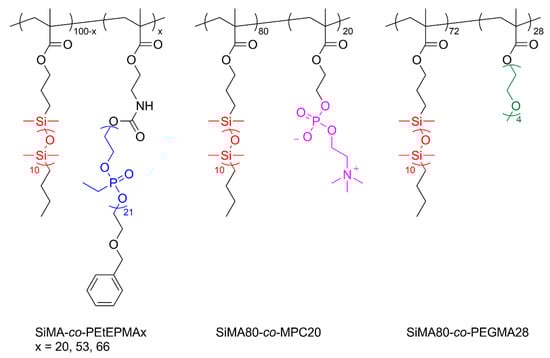 Chemical structure of SiMA-co-PEtEPMAx, SiMA-co-MPC20, and SiMA-co-PEGMA28 amphiphilic copolymers.