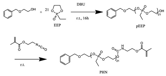 The cyclic monomer 2-ethyl-2-oxo-1,3,2-dioxaphospholane (EtEP) was polymerized by anionic ring opening polymerization (AROP) by using 2-(benzyloxy)-ethanol as the initiator and 1,8-diazabicyclo(5.4.0)undec-7-ene (DBU) as the catalyst. The macromonomer PEtEPMA was obtained by terminating the polymerization with an excess of 2-isocyanatoethyl methacrylate (Scheme 1). Successful polymerization and activation of the chain end was confirmed by 1H and 31P NMR spectroscopy and by GPC analysis. The average number degree of polymerization of the polyphosphonate side chain was 21, as evaluated by 1H NMR in accordance with the previously reported procedures [46,47].
