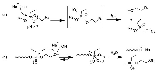 Proposed hydrolytic degradation mechanisms of poly(ethylene ethyl phosphonate)s in alkaline conditions: (a) nucleophilic attack of hydroxyl ions to the phosphorus center. (b) mechanism of backbiting reaction.