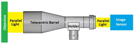 Compared to conventional lenses, in which the magnification varies with the distance between the lens and the object, telecentric lenses have a constant field of view at all distances from the lens. As a result, they eliminate the parallax error inherent in traditional fixed-focal length lenses and, therefore, find widespread use in machine vision-based systems where precise and repeatable measurements are required, such as metrology, microlithography, semiconductor manufacturing, and so on [8,9,10,11,12]. Figure 1 presents a simple schematic illustration of a typical coaxial bilateral telecentric optical system consisting of a telecentric barrel, a coaxial light source, a holder, and an optical imaging system.