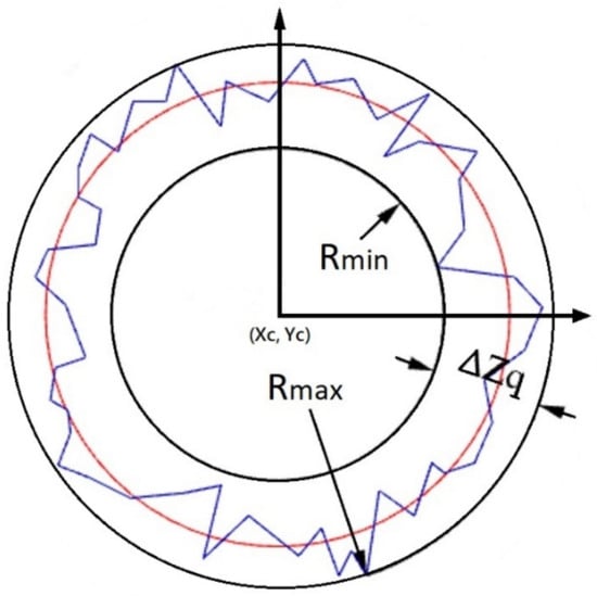 The most common methods for determining roundness errors include the Least Squares Circle (LSC) method, the Minimum Zone Tolerance Circle (MZC) method, the Maximum Inscribed Circle (MIC) method, and the Minimum Circumscribed Circle (MCC) method [35]. Figure 2 illustrates the LSC method, in which the center of the circle is first determined by identifying the circular contour which minimizes the sum of squared error (SSE) between the inner and outer radii of the interior surface (shown in red in Figure 2). This center point is then used to draw the circumscribed and inscribed circles of the barrel interior surface, respectively (see two black lines in Figure 2). Finally, the roundness of the circle (ΔZq) is quantified as the radial distance (Rmax–Rmin) between them [36]: