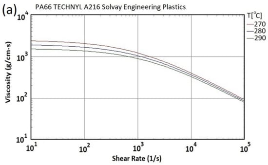 (a) Viscosity and (b) P-v-T properties of PA66 material (Source: Moldex3D material library).