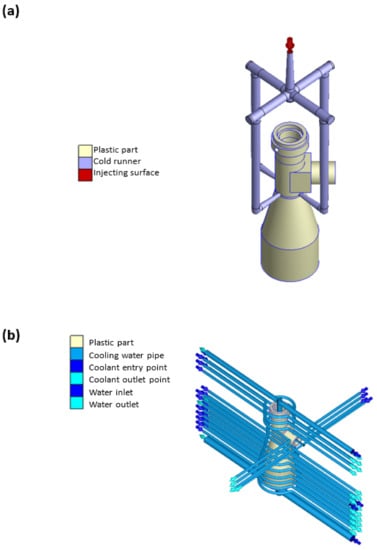 Figure 6a,b show the gating and cooling system models used in the simulations. As shown in Figure 6a, the gating system was designed with four runners to accommodate the large component size and thin wall thickness (3 mm). Moreover, the cooling water runner system was numerically designed to fit snugly around the outside surface of the plastic barrel, and a baffle-type water runner was used to prevent internal heat accumulation (see Figure 6b).