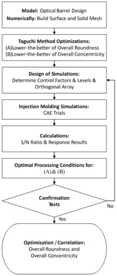 Figure 7 presents a flowchart of the hybrid Taguchi/CAE optimization process performed in the present study to identify the plastic injection molding processing parameters which minimize the overall roundness and overall concentricity of the optical barrel. As shown, the process commenced by constructing the numerical model described in the previous section and establishing the build surface and solid mesh. Having chosen suitable signal-to-noise (S/N) ratios for evaluating the quality of each simulation outcome, the Taguchi design processes were defined by establishing the control factors and level settings of interest. For some specific quality requirements such as deformation, warpage, shrinkage, weld line, air trap, roundness, concentricity, etc., each of these quality characteristics will have different influential processing factors. Therefore, in order to find the best combination of parameters, the Taguchi method is usually used to screen the most influential factors. This method is to utilize the statistical operation of the orthogonal array (OA) to find the optimal parameter combination. In Taguchi method, OA is a general partial factorial design. It is based on an orthogonal design matrix, allowing users to consider selected subsets of multi-factor combinations at multiple levels. Orthogonal arrays are balanced to ensure that all levels of all factors are considered equally in statistics. Other less influential parameters adopt the recommended values of polymer materials or injection molding machines. Generally speaking, the processing factors that have an influence on deformation are related to temperature and packing. After preliminary evaluation and calculation, five control factors were chosen, namely, (A) the injection pressure, (B) the packing pressure, (C) the melt temperature, (D) the mold temperature, and (E) the cooling time. As shown in Table 2, each of the five control factors was assigned four different level settings.