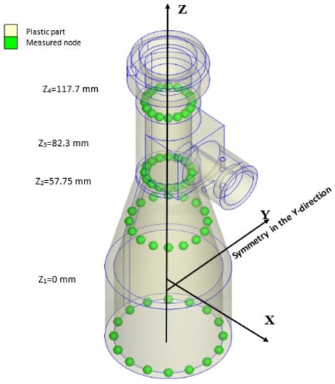 The geometry model of the telecentric lens barrel and positions of the tracked nodes during the simulations were defined in Rhinoceros. The model was then imported into Moldex3D to design the mold cavity and the gate, runner and cooling system, as well as to perform the molding flow simulations. The simulations considered the use of PA66 polymer material with the properties shown in Table 1 as the feedstock material. The total warpage was obtained directly from the output results of the mold flow analysis, while the roundness was calculated based on the distance between each tracked node and the offset center, and the concentricity was computed as the shortest distance between the offset circle center and the original axis.