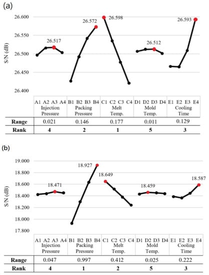 Figure 9a,b show the Taguchi response graphs for the overall roundness and overall concentricity, respectively. Referring to Figure 9a, it is seen that the optimal overall roundness is obtained using factor level settings of A3, B4, C1, D3, and E4, i.e., an injection pressure of 220 MPa, a packing pressure of 240 MPa, a melt temperature of 275 °C, a mold temperature of 90 °C, and a cooling time of 17 s. Furthermore, the simulation results show that the overall roundness is dominated by the melt temperature (Rank 1), packing pressure (Rank 2), and cooling time (Rank 3) in sequence. By contrast, the injection pressure and mold temperature, with smaller S/N ranges of 0.020909 dB and 0.010688 dB, respectively, have only a relatively minor effect on the overall roundness. As shown in Table 3, the S/N value of the overall roundness under the optimal processing conditions (26.755 dB) is 0.283 dB higher than that of the barrel produced under the standard processing conditions (26.472 dB). Moreover, the S/N value is also higher than that produced in any of the simulation runs in the OA. In other words, the effectiveness of the optimized parameter design in minimizing the overall roundness of the molded plastic barrel is confirmed.