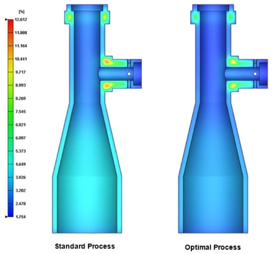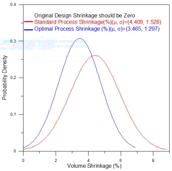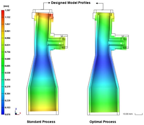 Cross-sectional shrinkage of final part processed using standard conditions (left) and optimal conditions (right). (Volume shrinkage: %).