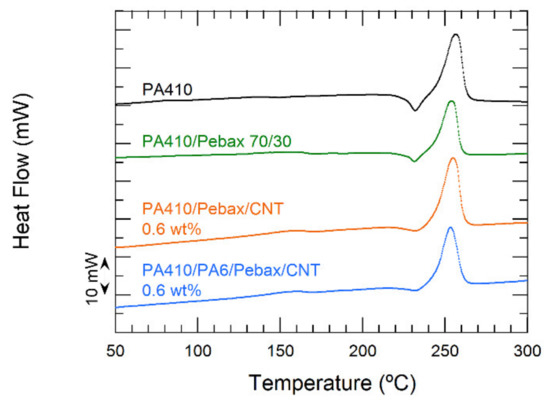 DSC curves of pure PA410, PA410/Pebax 70/30 unfilled blend and, as an example, PA410/Pebax/CNT and PA410/PA6/Pebax/CNT NCs containing 0.6 wt% CNTs. Curves have been shifted in the vertical axis.