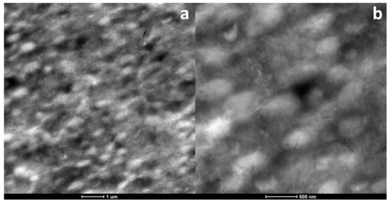 TEM micrographs of the PA410/Pebax 70/30 blend: (a) At ×5000 magnification; (b) at ×14,500 magnification.