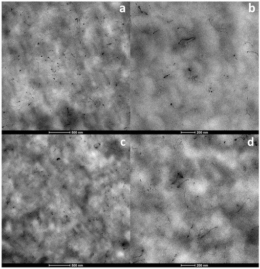 Figure 4 and Figure 5 show, respectively, the TEM micrographs of unfilled PA410/Pebax 70/30 blend and of PA410/Pebax/CNT ternary (Figure 5a,b) and PA410/PA6/Pebax/CNT quaternary (Figure 5c,d) NCs with a CNT content of 0.4 wt%, at ×14,500 and ×25,000 magnifications. It should first be mentioned that the presence of CNTs reduces the contrast between the two polymeric components (polyamide-based matrix and Pebax) with respect to the unfilled polyamide/Pebax binary systems (see Figure 4), due to the high contrast between the CNT and any polymeric component. Although not as clear as in the unfilled binary system, the matrix and dispersed elastomeric phases can still be distinguished, the former being darker than the latter. When the CNT distribution is examined, they seem to be mainly located in the PA410 or PA410/PA6 continuous phase of the ternary and quaternary systems, respectively. Some of them can also be observed in the Pebax dispersed phase but in a clearly lower amount. This indicates that CNTs have a higher chemical affinity for the polyamide phase than for the Pebax phase. Indeed, it is widely known that the more polar the matrix, the higher the affinity of the CNTs for that matrix [51,52,53]. In fact, several studies have shown that CNTs in thermoplastic/thermoplastic/CNT systems tend to locate in the most polar phase [30,31,52,54], and in PA/elastomer/CNT NCs, in particular, they tend to locate in the PA phase [30,31]. Thus, the CNTs, even the ones that are not chemically modified [52], often show high affinity for the polyamide phase because the interfacial tension is usually lower between the PA and the CNTs [52]. If we consider the chemical structure of the polymeric components that are present in the systems under study, PA410, PA6, and Pebax include highly polar amide groups within their structure, which explains the affinity of CNTs for both the PA phase and the Pebax phase. However, the density of amide groups is not the same in all the components; PA6 has the highest amide group density, closely followed by PA410, and, lastly, Pebax, with the lowest amide group density, which is composed of polyether in 52–56% and where the amide groups are separated by 11 carbon atoms.