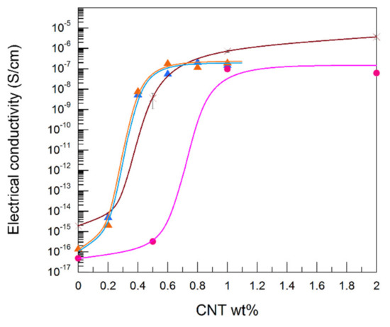 Electrical conductivity of PA410/Pebax/CNT (▲) and PA410/PA6/Pebax/CNT (▲) NCs vs. the CNT content. PA410/CNT (x) and PA410/PA6/CNT (●) systems have been represented as a reference [1].