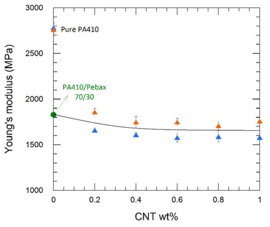 Young’s modulus of PA410/Pebax/CNT (▲) and PA410/PA6/Pebax/CNT (▲) NCs vs. the CNT content. Pure PA410 and the PA410/Pebax2 70/30 blend have been represented as a reference.