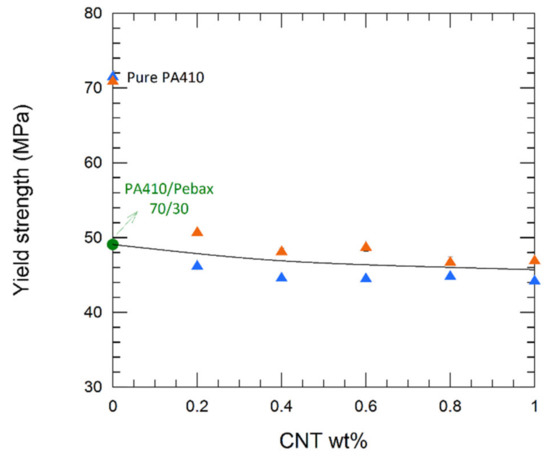 Yield strength of PA410/Pebax/CNT (▲) and PA410/PA6/Pebax/CNT (▲) NCs vs. the CNT content. Pure PA410 and the PA410/Pebax2 70/30 blend have been represented as a reference.
