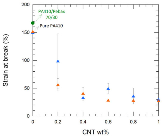 Strain at break of PA410/Pebax/CNT (▲) and PA410/PA6/Pebax/CNT (▲) NCs vs. the CNT content. Pure PA410 and the PA410/Pebax2 70/30 blend have been represented as a reference.
