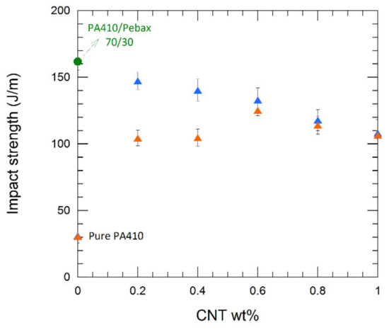 Finally, Figure 12 shows the notched impact strength values of the PA410/Pebax/CNT and the PA410/PA6/Pebax/CNT systems vs. the CNT content. The values corresponding to the pure PA410 and the PA410/Pebax 70/30 blend are represented as a reference. As expected, and as with the strain at break, CNTs have a negative effect on the capability of these systems to absorb energy during deformation or fracture processes in comparison to the unfilled PA410/Pebax 70/30 blend. Nonetheless, in the case of impact strength, the comparison with the pure PA410 is very favorable. In fact, the PA410 shows a very low impact strength resulting from its high notch sensitivity, but the Pebax containing NCs show values that are from three to five-fold higher than that of the pure PA410. Still, and as mentioned in the case of the unfilled PA410/Pebax system, the results are not even close to the super-toughness observed in other PA/elastomer/CNT systems [30,31].