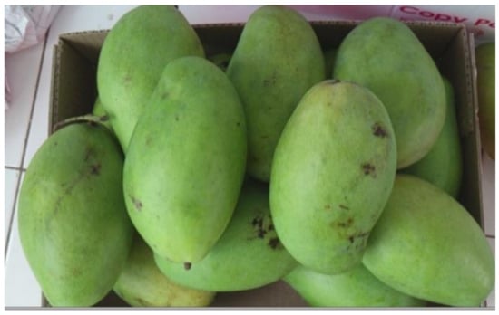 Mature green mango fruits (Mangifera indica L.) (Figure 1), from the Dak Lak province, Vietnam, were harvested and transported to the Lab of the University of Technology and Education, Danang, within 24 h. Uniform mango fruits in color, shape, and weight (390–410 g) were used for this research. They were washed with water and then with ethanol 60% and dried before treatment with the coatings.