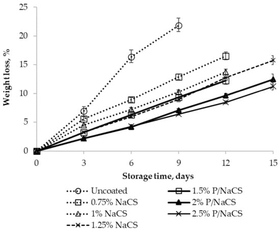 Effect of coating on the weight loss of mango fruits. Numbers are the mean ± standard errors of three replications. Note: P/NaCS means pectin plus nanochitosan with ratio 50:50 for all Figures.