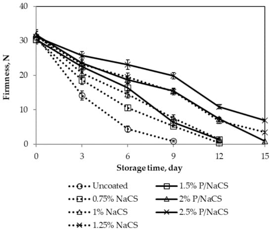 Effect of coating on firmness of mango fruits. Numbers are the mean ± standard errors of three replications.