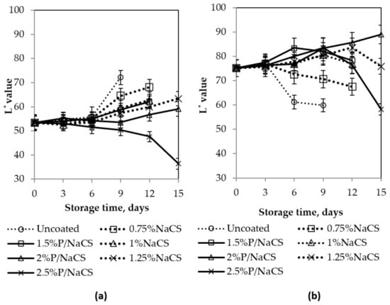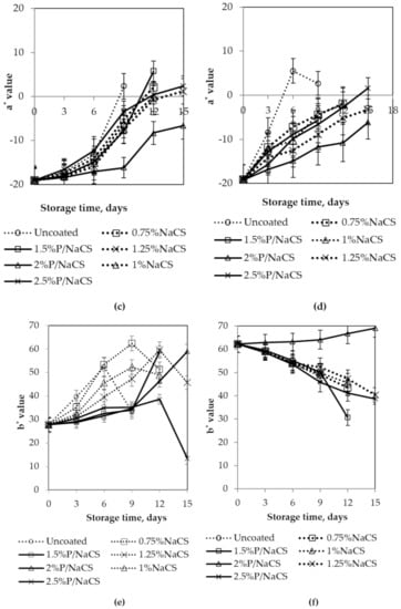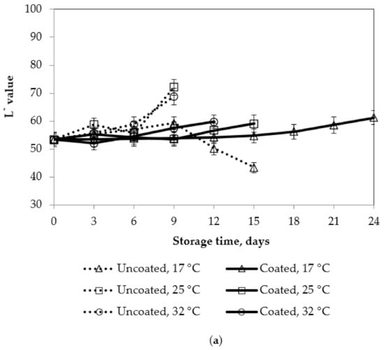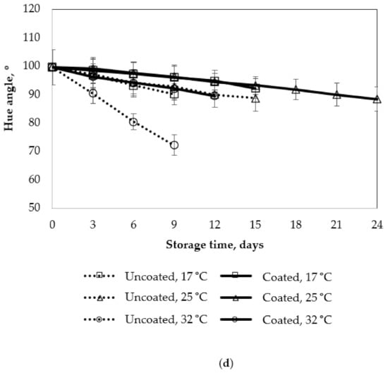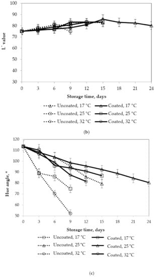 Figure 9 shows that the L* values of mango peel increased during storage time. The L* value of the control samples had a slower increase at 17 °C, compared to those at 25 °C and 32 °C, but the L* value decreased after 9 days of storage. The increase in L* value of coated mango samples was slower than that of uncoated mango samples at all storage temperatures. When the storage temperature decreased, the L* value of the coated mango samples increased slowly. Lowering the storage temperature of uncoated mango samples delayed the ripening process, which kept the mango green and resulted in a low lightness. Normally, ripe fruits turning yellow increases the lightness of fruits. The L* value of the mango flesh was similar to the L* value of the mango peel. However, when mangoes were ripe, the flesh turned dark yellow, which explains the reason that the L* values of all mango samples decreased at the end of the storage time. The lower L value changes in the coated mango may be related to the effect of the coating in creating modified atmospheres within the mango fruit. Contrast to L value, hue angle of mango fruits decreased during fruit ripening in storage. Hue angle of mango fruit also decreased with increasing storage temperature. This indicated that lower storage temperature slowed down the de-greening processes in mango fruits. These results were consistent with some previous researches in apricots and peaches []. The actual colors of uncoated and coated mangoes were also presented in Figure 10.