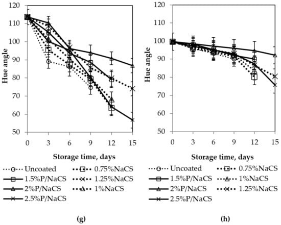 Effect of coating on color of mango fruits. Numbers are the mean ± standard errors of three replications. (a) L* value, (c) a* value, (e) b* value, (g) hue angle in mango peel, (b) L* value (d) a* value, (f) b* value, and (h) hue angle in mango flesh.