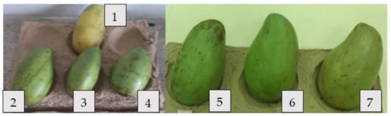 The color of mangoes at 9th day storage: (1) the control sample (uncoated); (2) 0.75% NaCS coating; (3) 1% NaCS coating; (4) 1.25% NaCS coating; (5) 1.5%P/NaCS coating; (6) 2% P/NaCS coating; and (7) 2.5% P/NaCS coating.