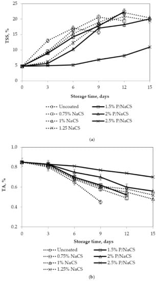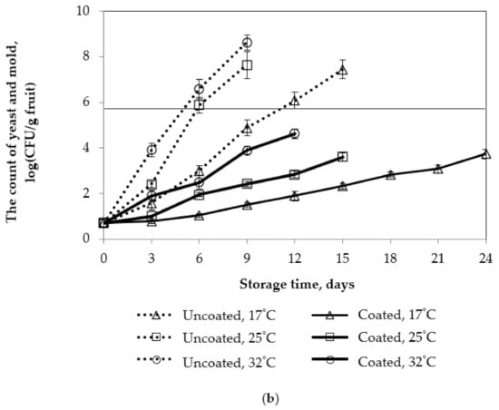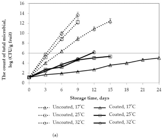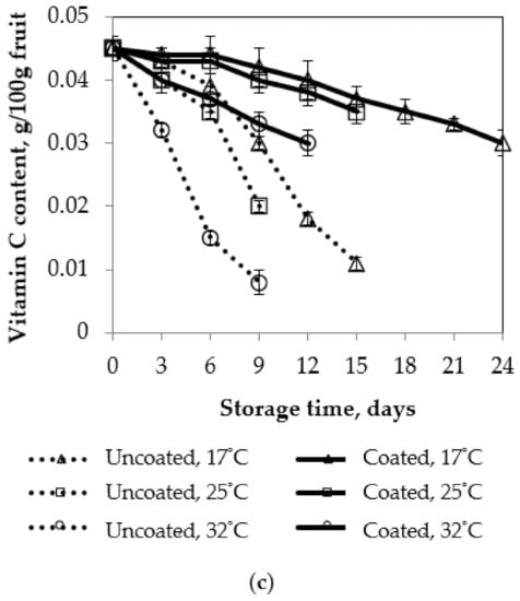 In our recent finding, a decrease of TSS contents and the maintenance of total acidity and vitamin C content could be explained by the fact that the pectin/nanochitosan coating could form a thin film with micropores and delay the physiological and biochemical processes, such as the conversion of starch into sugars, by modifying the internal atmosphere of the package []. At the end of the storage time, the control sample began deteriorating, due to increasing respiration rate, thereby reducing the chemical compositions content. In addition, TSS contents had a linear correlation with the mango firmness and color during storage time. All coated mango samples maintained TSS and vitamin C contents in the acceptable limit range for 12, 15, and 24 days, at storage temperatures of 32 °C, 25 °C, and 17 °C, respectively; uncoated mango samples exceeded the acceptable limit range after nine days of storage.