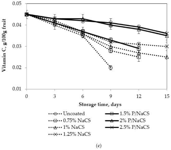 At first, the total soluble solids of mango fruit showed an increasing trend and then a decreasing trend. Both the nanochitosan coating and pectin/nanochitosan coating delayed the increase of total soluble solids of mangoes. The higher concentration of coating dispersion showed the slowest increase of total soluble solid. However, the TSS of mango fruits coated with 2.5% pectin/nanochitosan increased slowly during fruit ripening in storage. This was consistent with the results of fruit firmness. These results indicates that mango fruits coated with 2.5% pectin/nanochitosan were not able to continue ripening. A similar result was observed when the chitosan coating was applied for some fruits according to Bautista-Banos et al. [] or in another research, chitosan coating decreased the TSS of fruit juice in mango [,,]. Additionally, based on the results, the total acid and vitamin C of mango fruit generally decreased during storage. At first, it showed a slow decreasing trend and then a significant decreasing trend. Both the nanochitosan and pectin/nanochitosan coating treatment delayed the decrease in content of total acidity and vitamin C. Similar to TSS, the total acidity of mango fruits coated with 2.5% pectin/nanochitsan was higher than others; this could be explained by the fact that mango fruits could not continue ripening and the respiration rate may be inhibited by coating.