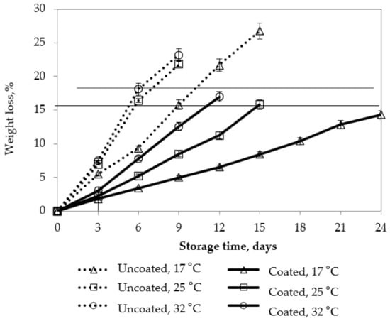 The effects of storage temperature and pectin/nanochitosan coating were significant on fruit weight loss (Figure 7). The results showed that low storage temperature significantly reduced weight loss of mango fruits over the 24 days of storage. The weight losses of mango fruits were in the range of 14.3–26.7%, depending on coating and storage temperature. The weight loss of the coated fruits was lower than that of the uncoated fruits at all temperatures. After 9 days of storage, weight loss of the uncoated samples was 23.2, 21.8, and 15.8%, while the weight loss of the coated samples was 12.6, 8.5 and 5% at 32, 25, and 17 °C, respectively.