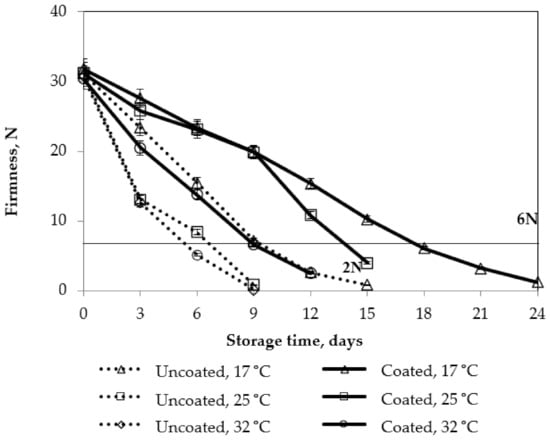 In our findings, in terms of acceptable weight loss and firmness for consumption of mangoes, the longest storage time for uncoated mango was 15 days at 17 °C, while coated mango lasted for storage times of 12, 15, and 24 days at 32 °C, 25 °C, and 17 °C, respectively.
