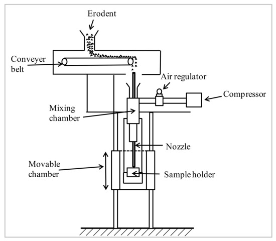 Schematic representation of erosion test setup is depicted in Figure 2. The setup confirms to ASTM G76 standard and is capable of reproducing repetitive erosive conditions to assess the erosive resistance of samples. The test rig comprises of an air compressor, mixing chamber (air and erodent particles), and accelerating compartment. Erodent particles are fed through the conveyor belt to the mixing chamber in which dry compressed air is supplied. Compressed erodent particles influence on the target samples with the aid of an accelerating chamber and convergent nozzle of 1.5 mm diameter. Samples can be held at different angles concerning the particles’ impingement. Standoff distance is the distance between the tip of the nozzle and specimen holder. The standoff distance can be varied by moving the specimen holder with respect to the fixed nozzle. The velocity of the erodent particles is determined using the standard double-disc method [20]. Samples are cleaned in acetone and weighed to an accuracy of ±0.001 mg using a precise electronic balance before the test. Weight loss before and after the tests are recorded for observing the erosion rate. The process as mentioned earlier is repeated until the erosion rate achieves a stable state called steady-state erosion rate.