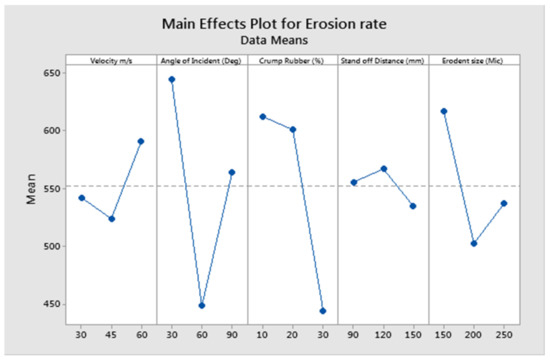 The erosion rate is independent of erodent particle size beyond a critical value and lies between 100 and 200 μm [41,47,48]. Erosion tests performed with erodent particles in the range of 100 to 200 μm depict a higher erosion rate with the increase in the size of erodent particles [41]. However, above the critical value (>200 μm), erosion rates are seen to decrease owing to the limited amount of erodent particles impacting the target surface [16]. Silicon carbide erodent particles are irregular in shape intended to erode maximum material from the target. However, the lowest erosion rates are observed with 250 μm erodent particles in the present study. Analysis of the overall result concludes that factor combination of A2, B2, C3, D3, and E3 gives minimum erosion rate as evident from Figure 3. The statistical means of GRG were used to draw the main effects plot and largest mean value is considered to be the opimum level of parameter.