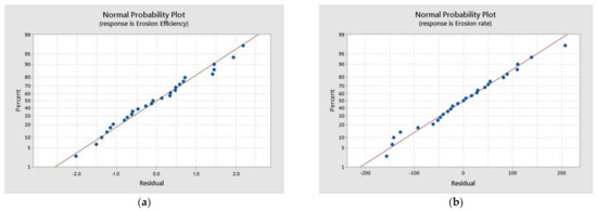 Standard probability plot for (a) Erosion efficiency and (b) Erosion rate.