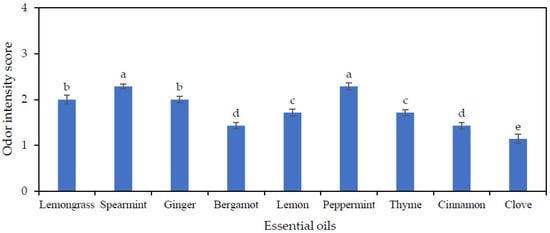 Screening of different essential oils (EOs) based on odor intensity score in table grapes. Values are mean ± standard deviation (n = 10). Different lowercase letters on the bars indicate a significant difference (p < 0.05).