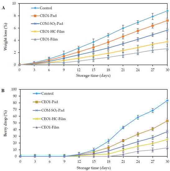 Weight loss (A) and berry drop (B) of TG without and with CEO antifungal packaging. Values are mean ± standard deviation (n = 6). See Figure 2 caption.