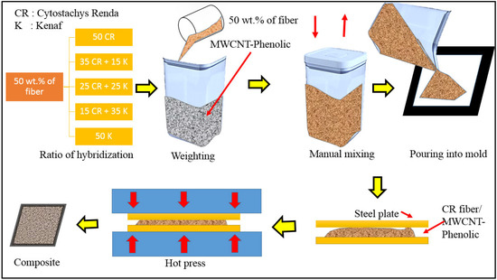 0.5 wt% of MWCNT was added to the phenolic resin and dry mixed using a ball milling for 25 h to produce a homogeneous distribution. CR and/or kenaf hybrid composites with a composition shown in Table 2 were produced using a mold size of 150 mm × 150 mm × 3 mm. The fiber was uniformly mixed manually, with 0.5 wt% MWCNT–phenolic resin for 15 min. The mixture was then adequately spread into the mold. The molding plate was mounted in a hot press mold with a temperature of 150 °C and pressure of 10 tonnes, as illustrated in Figure 1. The composites were compressed for 10 min and were cold-pressed for 5 min.