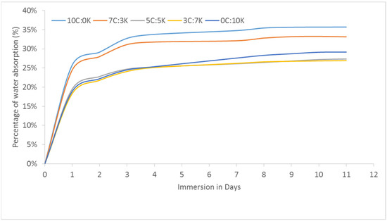The water absorption percentage of CR and/or kenaf reinforced with phenolic composites curve was plotted against immersion days, as shown in Figure 2. From the graph, it is obvious that pure CR phenolic composites display high water absorption. Pure CR reinforced with phenolic composite was indicated to be more porous relative to kenaf fiber, which had permitted a significant amount of water molecules to diffuse to the composites. The hydrophilicity of the natural fiber depends on a number of hydroxyl groups responsible for absorbing water by the hydrogen bonding; this hydroxyl group is the key factor of water absorption and deterioration of the mechanical properties of the natural fiber-based composite [26,27]. These hydroxyl groups found in cellulose and hemicellulose offered quick access to water in the natural fiber-based composites. In natural fiber, there is an inter-fibrillary area of the cellulose framework that absorbs water molecules from the cracks and micro-voids that exist on the composite surface [28]. After being immersed for a long period in water, composites retained water molecules through capillary motion, and filled the composite voids and micro-cracks.
