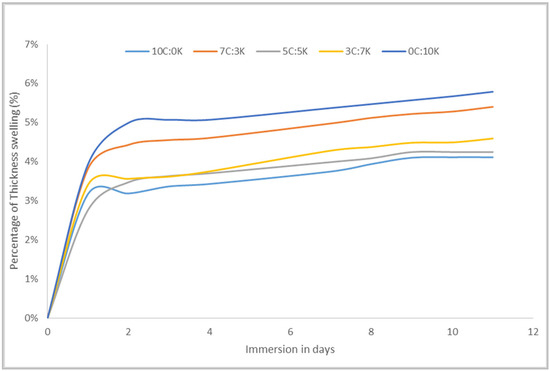 The thickness swelling percentage of CR and/or kenaf reinforced phenolic composites curve was plotted against immersion days, as shown in Figure 3. It can be seen that CR fiber phenolic composite was more stable to the swelling tendency, resulting in the lowest percentage (4.11%) of swelling, among others. Meanwhile, the highest percentage of thickness swelling resulted in kenaf-reinforced phenolic (6.29%) and hybrid composites thickness swelling falling between the thickness swelling of both pure fiber composites. Thickness swelling was closely related to the fiber composite dimensional stability, which was influenced by temperature and humidity [30]. The micro-cracks in the interfacial area induced by natural fiber swelling can promote the diffusion of water through micro-cracks and voids [26]. Weak interaction with fiber/matrix and fiber distribution influenced thickness swelling and dimensional stability of the composites [21]. It will restrict the swelling percentage and increase the dimensional stability of composites with a good interface and distribution between CR and kenaf fiber.