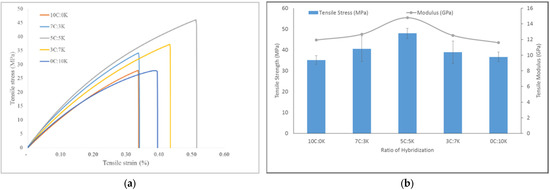 (a) Tensile stress vs. strain curve, (b) tensile strength and modulus, of hybridization between C and K fibers.