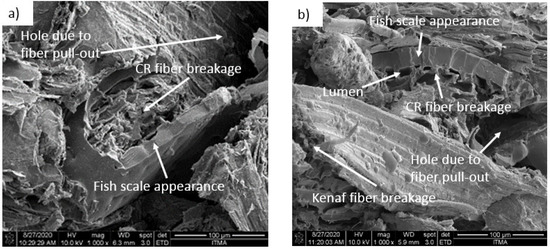 A fractographic investigation was carried out using FESEM for a tensile fractured specimen. In order to examine the morphology and probable interface adhesion between matrix and fibers, micrographs taken at 1000× magnification were used. Figure 5a indicates that the fish scale appearance revealed the fiber adhered to the phenolic matrix and showed a good interface between CR fiber and MWCNT–phenolic resin. Meanwhile, Figure 5b–d demonstrate CR and kenaf hybrid fibers in the phenolic resin. It is noted that CR fiber lumen was larger in comparison to kenaf fiber. CR pore size had large openings, while kenaf had smaller pores that were compact in nature. It could be the reason the density of CR is lower than that of kenaf. From the figures, the CR fiber surfaces are rough and more porous (due to the removal of silica in certain cases), contributing to a decrease in density. This result affected the composite density, where the higher void content had a low density. The lumen of CR fiber influenced higher void and water absorption compared to kenaf fiber. However, the thickness of the swelling of the CR was lower than that of the kenaf due to the presence of the thick layer of the fish scale on the surface of the CR fiber, which resisted the dimensional change even the CR fiber absorbed the water.